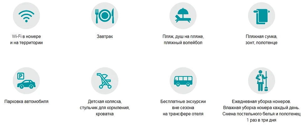 Номера всех категорий дополнительно укомплектованы раскладными креслами, которые могут использоваться как дополнительное место.