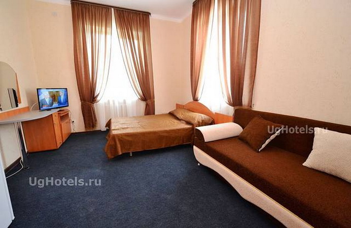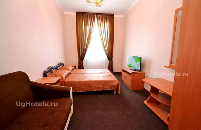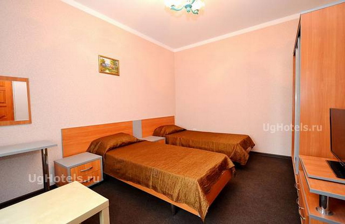 В номере либо одна двухспальная и две односпальные кровати. Либо одна двухспальная кровать и двухспальный диван. Номера с террасой. В номере шкаф и тумбочки