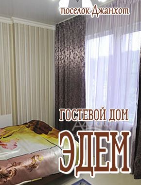 Гостевой дом "Эдем" расположен на лесной опушке в 30 метрах от центральной улицы курортного местечка Джанхот. Гостевой дом построен в 2010 году и предлагает гостям номера различного уровня комфорта и стоимости, от номеров эконом класса во дворе, до номеров люкс с собственной кухней. Район где расположена гостиница очень тихий, шум с пляжа не слышен, больших строений и других гостевых домов в непосредственной близости нет. Всё располагает к спокойному отдыху. Территория: Гостевой дом "Эдем" расположен в заказнике реликтовой пицундской сосны п. Джанхот, недалеко от Геленджика. Отдыхающие смогут насладиться покоем и тишиной, на фоне почти не тронутой человеком природы. Всегда чистое и спокойное море в 10 мин. ходьбы. Размещение. Номерной фонд гостиницы: двухместный люкс на 2 человека с удобствами; двухкомнатный номер с кухней на 4 человека с удобствами; двухкомнатный люкс на 4-5 человек с удобствами; четырехместный люкс с удобствами. Домики на три человека, удобства на улице. Квартира трехкомнатная до 5 человек, с удобствами. В каждом номере есть телевизор, холодильник и сплит-система.
