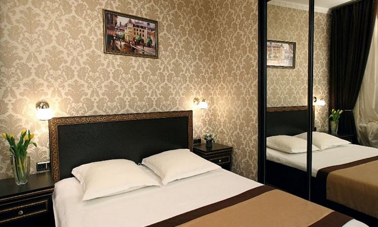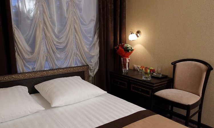 Уютный номер площадью 16 кв.м. выполнен в теплых тонах с элементами арт-деко. Номер оборудован собственной ванной комнатой с душем, кондиционером, кабельным телевидением, холодильником, двуспальной кроватью, шкафом, прикроватной тумбой, стульями, журнальным столиком и большим зеркалом. Каждому гостю предоставляются туалетно-косметические средства гигиены, тапочки и мягкий халат.