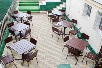 Беседка, зеленая зона, столы, стулья, шезлонги, зонты, скульптуры, скамейки.