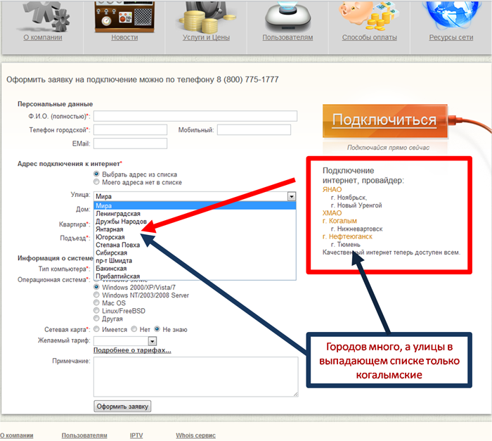 Однако, во вкладке "Контакты" вы размещаете информацию, где уверяете нас, что "ваша компания имеет мультисервисную сеть связи в Тюмени и области, а так же по ЯНАО"