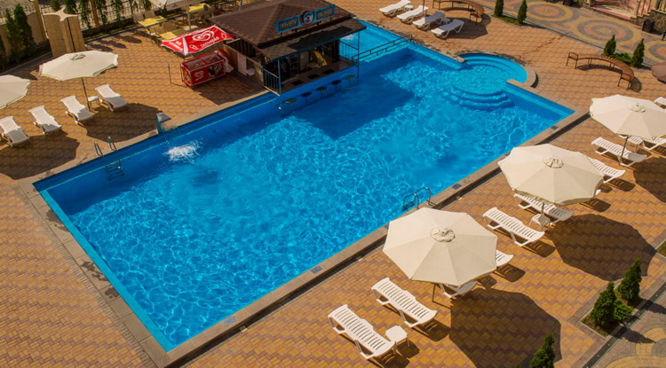 Изюминка отеля – бассейн с Pool-Bar. Вы можете заказать закуски и напитки из расположенного бара в бассейне, даже не выходя из него! Строительство Pool-bar давно приобрело популярность в странах развитого туризма и гостиничной индустрии. Размер бассейна с пресной водой – 8*18 м. оснащен многоступенчатой системой очистки воды без использования хлора и удобным входом как для взрослых, так и для детей постепенно уходящим на большую глубину, благодаря этому отдых в бассейне комфортный и безопасный. Но и для самых маленьких гостей в отеле предусмотрен бассейн 3*6м., для удобство наших дорогих гостей, один бассейн плавно перетекает в другой!