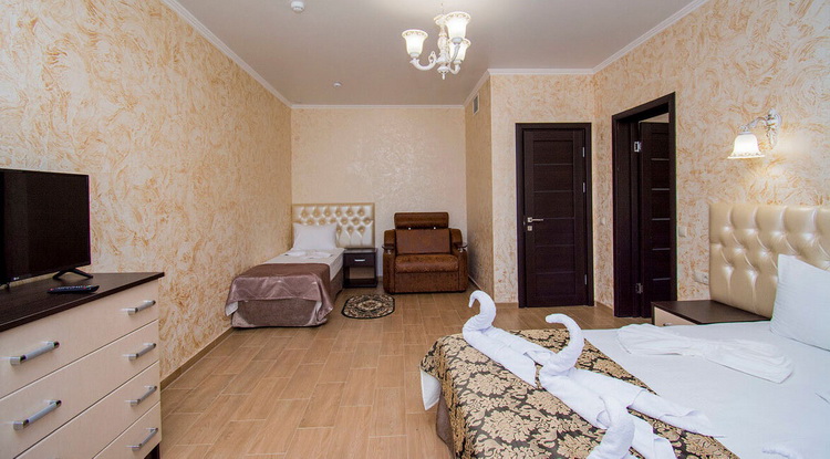 80 м² — 2 спальни , в каждой спальне 1 кровать двухспальная (ширина 180 см), мебель из массива класса премиум, высокие потолки с арками и ручной росписью, независимые сплит-системы, 3 TV панели, большой холодильник, кухня, 2 санузла, в гостинной угловой диван и кресло-качалки, балкон
