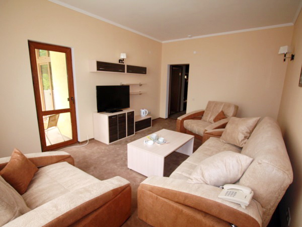 Двухкомнатный номер состоит из: коридора, включающая в себя шкаф-купе с чемоданицей, индивидуальный сейф; просторной спальни с широкой кроватью с ортопедическим матрасом, плазменной панелью, холодильником; комфортной зоной для отдыха, гостиной с мягкой мебелью и так же с плазменной панелью. Ванная комната оборудована душевой кабиной, современной санте... Подробнее ... |