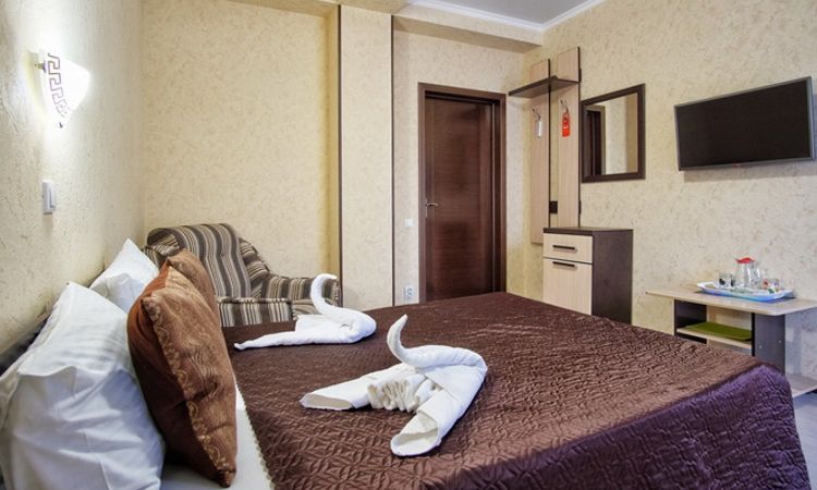 Пляж: муниципальный (общественный) галечный, оборудован лежаками зонтиками кафе услуги проката. Год строительства: 2010 Территория: 0,08 га охраняемая, ухоженная. Номера: Стандарт: мебель, холодильник,фен. чайник. сплит-система, ТВ, санузел c душем. площадь18 кв метр; Студия: мебель, холодильник, сплит-система, ТВ, санузел с душем, полностью оборудованная кухня фен чайник, диван 33 кв метр; Люкс: две комнаты, 2 телевизора. мебель, холодильник, чайник. фен. сплит-система, , санузел с душем, диван. полностью оборудованная кухня. балкон 42 кв метр. В каждом номере: телевидение (цифровое общественное вещание), холодильник, индивидуальный кондиционер, санузел с душем. Покрытие пола – ламинат. Общее количество номеров: 20. Уборка номеров - через день, смена постельного белья - раз в 5 дней, смена полотенец - через день. В стоимость включено: проживание, пользование кухней, мангалом. Wi-Fi на всей территории При размещении в отеле не гарантируется этаж, вид из окна, расположение номеров рядом, спальное место (двуспальная кровать или раздельные кровати), если данной информации нет в описании номера. Дети: принимаются любого возраста; до 2 лет бесплатно, без предоставления места. Детям: высокие стульчики в столовой, детская кроватка в номере, . Документы при заселении: на взрослого - паспорт, на ребенка до 14 лет – свидетельство о рождении. Расчетный час: заезд с 14:00, выезд до 12:00. Инфраструктура: парковка, сейф на стойке регистрации, Wi-Fi на ресепшн, услуги прачечной, Спорт: настольный теннис, пляжный волейбол. Услуги: парковка охраняемая – 100 руб./сутки; аренда детской кроватки - 300 руб./сутки (доп. услуга); продление номера (по возможности) – 200 руб./час; дополнительное место до 16 лет -500 рублей/сутки, от 16 лет-1000 рублей /сутки ( с 1 июня по 30 сентября) Курение: разрешается только в строго отведенных местах. Животные: привозить животных не разрешается.