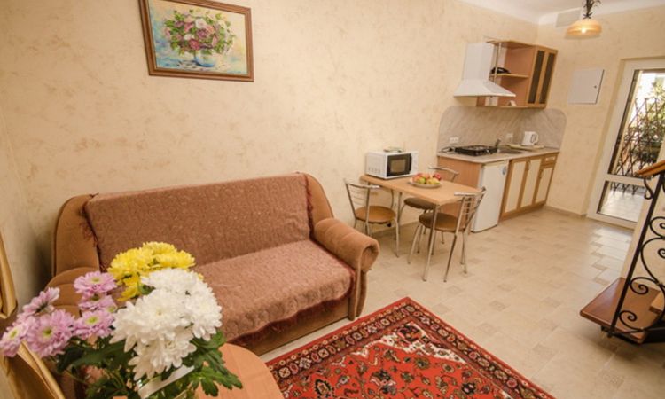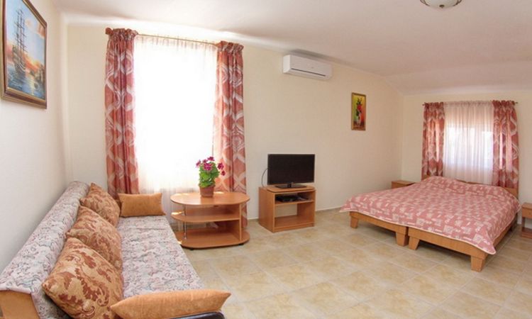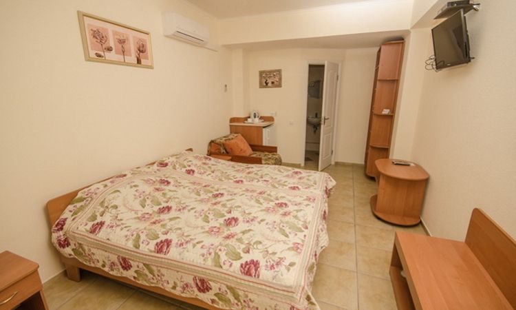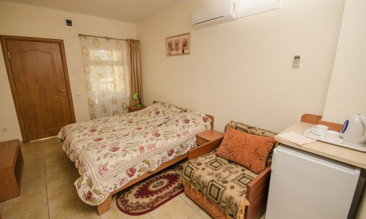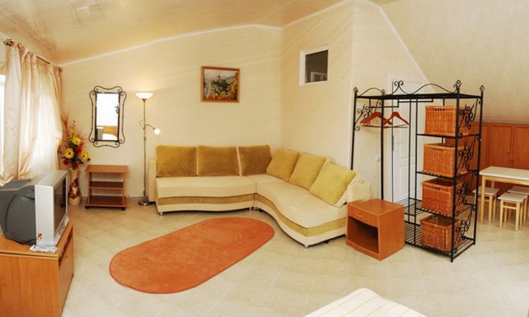 В номере (S=25м2) двуспальная кровать, диван, кондиционер, TV, интернет Wi-Fi, холодильник, электрочайник. Санузел (душ). Возможна установка дополнительного места. Номер имеет просторную зону отдыха (S=20м2) с летней мебелью.