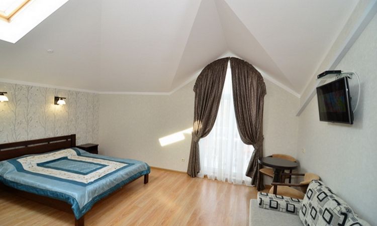Номера "люкс" 2-комнатный, 2-х спальная кровать + 2-х спальный диван, представляют возможность наслаждаться отдыхом в полной мере. В интерьере используются только дорогие и качественные материалы. Большая итальянская двуспальная кровать. Площадь номеров - 25 кв. м. Площадь балконов - 6,5 кв. м. В номерах "люкс" отеля в Учкуевке имеют возможность комфортно разместиться до 4-х человек. С балконов открывается прекрасный вид на море.