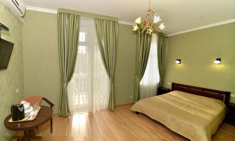 Номера категории "полулюкс", 2-х спальная кровать + 2-х спальный диван, выгодно отличаются хорошим уровнем комфорта в сочетании с невысокой ценой. Площадь номеров данной категории - 25 кв. м. Площадь балконов - 6,5 кв.м. Номера гостиницы Учкуевки дают возможность размещения до 4-х человек (кроме кровати, 2 дополнительных места на раскладном диване).