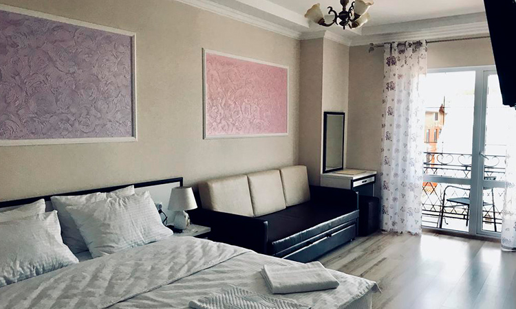 Трехместный номер с балконом, диваном и электрическим чайником.