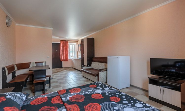 В каждом номере большая двуспальная кровать, раскладывающийся диван шириной 140 см, прикроватные тумбочки,шкаф, обеденный стол или уголок на 4 человека. Номера оборудованы сплит-системами и телевизорами с цифровым вещанием на 20 каналов.... Подробнее ...