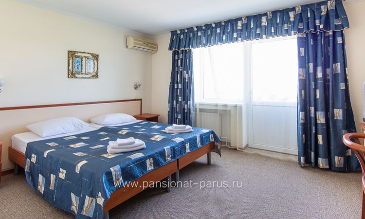 В номере: 2 односпальные кровати (с возможностью соединить в двухспальную) или одна двуспальная кровать, кресло-кровать, прикроватные тумбочки, шкаф, сейф, стол-бар, мини-холодильник, телевизор, сплит-система, телефон, балкон.