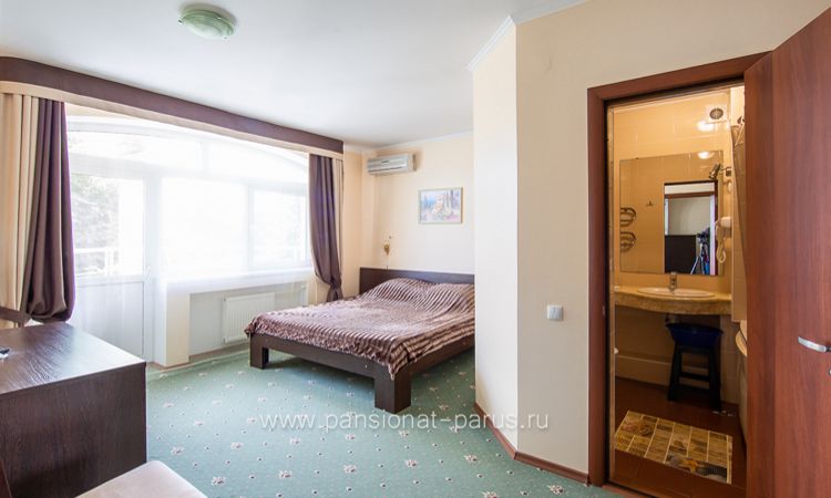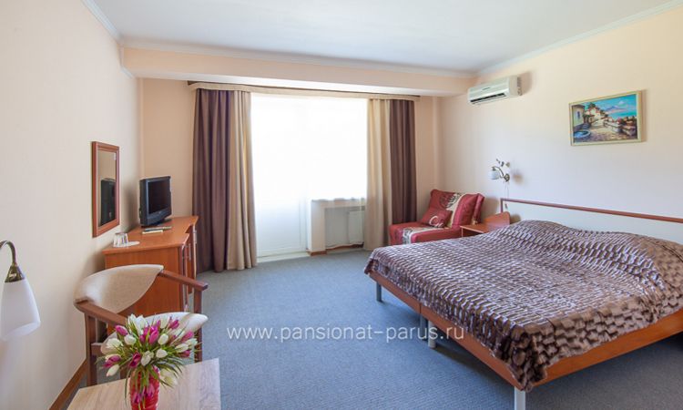 В номере: 2 односпальные кровати (с возможностью соединить в двухспальную) или одна двуспальная кровать, кресло-кровать, прикроватные тумбочки, шкаф, сейф, стол-бар, стулья, журнальный столик, мини-холодильник, телевизор, сплит-система, телефон, балкон (мебель).