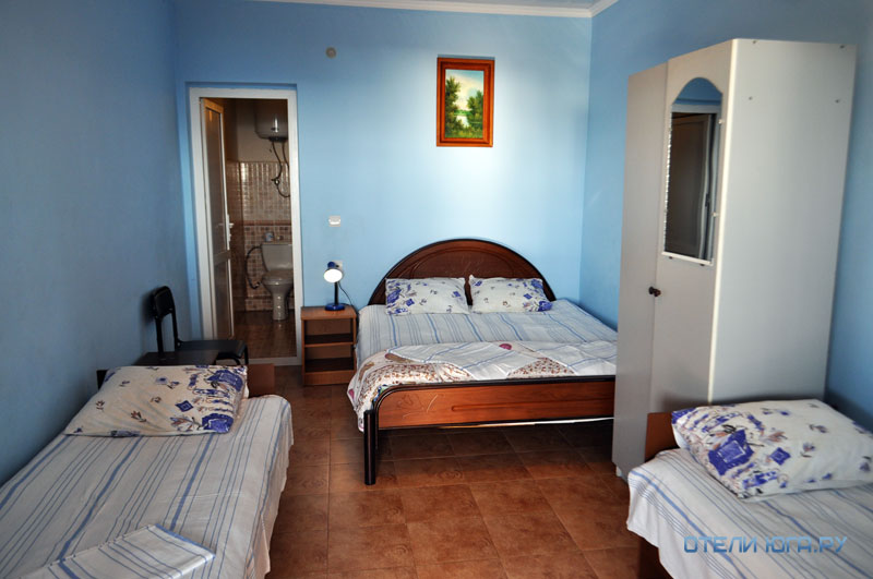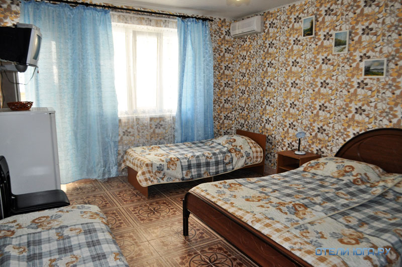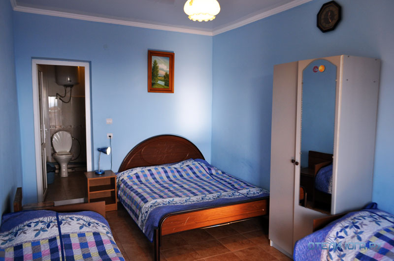 Двуспальная и односпальные кровати, шкаф, телевизор, спутниковое телевидение, тумбочка, столик, вентилятор, холодильник. Санузел с душем на этаже на 5 номеров (2 душевые, 2 санузла)... Подробнее ...