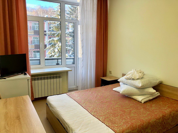 ОДНОМЕСТНЫЙ НОМЕР (СТАНДАРТНЫЙ) Одноместный номер с балконом, площадь — 16 кв.м. 1-5-й этажи. Ориентирован на восток и на запад В комнате: 1,5 спальная кровать, шкаф д/одежды, телевизор, холодильник, тумбочка, сан. узел, душ. В корпусе имеется лифт, теплый переход в лечебный корпус. • Прейскурант устанавливается из расчета стоимости номера, в соответствии с единым расчетным часом – 12 часов текущих суток, расчетный час- 8:00 Путевка с лечением включает: проживание в номере выбранной категории, питание 4- разовое по утвержденному меню или питание по типу шведский стол (на выбор), лечение, анимационные мероприятия по программе Санатория, настольный теннис, пользование спортивными площадками, в летнее время — посещение пляжа Лесного озера. ДВУХМЕСТНЫЙ СТАНДАРТНЫЙ НОМЕР 3 КОРПУС Двухместный номер с балконом, площадь — 16 кв.м. В комнате: две 1,5 спальные кровати,2 прикроватные тумбочки, шкаф д/одежды, телевизор, холодильник, сан.узел, душ. В корпусе имеется лифт, теплый переход в лечебный корпус. • Прейскурант устанавливается из расчета стоимости номера, в соответствии с единым расчетным часом – 12 часов текущих суток, расчетный час- 8:00 Путевка с лечением включает: проживание в номере выбранной категории, питание 4- разовое по утвержденному меню или питание по типу шведский стол (на выбор), лечение, анимационные мероприятия по программе Санатория, настольный теннис, пользование спортивными площадками, в летнее время — посещение пляжа Лесного озера СЕМЕЙНЫЙ (2-Х КОМНАТНЫЙ) Номер повышенной комфортности, 2-х комнатный, 2-х местный Номер повышенной комфортности (спальня, гостиная, ТВ, сан.узел), 2-х комнатный, 2-х местный В корпусе имеется лифт, теплый переход в лечебный корпус. • Прейскурант устанавливается из расчета стоимости номера, в соответствии с единым расчетным часом – 12 часов текущих суток, расчетный час- 8:00 Путевка с лечением включает: проживание в номере выбранной категории, питание 4-разовое по утвержденному меню или питание по типу шведский стол (на выбор), лечение, анимационные мероприятия по программе Санатория, настольный теннис, пользование спортивными площадками, в летнее время — посещение пляжа Лесного озера. НОМЕР «ЛЮКС» Двухместный семейный номер с двухспальной кроватью, с двумя комнатами, ориентирован на северо-восток В номере: гостиная, спальная комната, сауна, сан. узел, душевая кабина, телевизор. В корпусе имеется лифт, теплый переход в лечебный корпус • Прейскурант устанавливается из расчета стоимости номера, в соответствии с единым расчетным часом – 12 часов текущих суток, расчетный час- 8:00 Путевка с лечением включает: проживание в номере выбранной категории, питание 4- разовое по утвержденному меню или питание по типу шведский стол (на выбор), лечение, анимационные мероприятия по программе Санатория, настольный теннис, пользование спортивными площадками, в летнее время — посещение пляжа Лесного озера Примечания: • Цены указаны в рублях на 1 человека за койко-день. • При задержке выезда клиента после расчетного часа производится почасовая оплата (из расчета 1/24 стоимости номера). При задержке выезда от 12-24 часов после расчетного часа, плата взимается за койко-день согласно действующему прейскуранту. • Процедуры и программы, не включенные в базовое лечение, оплачиваются согласно действующему прейскуранту на медицинские у