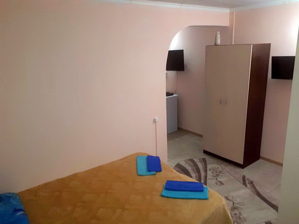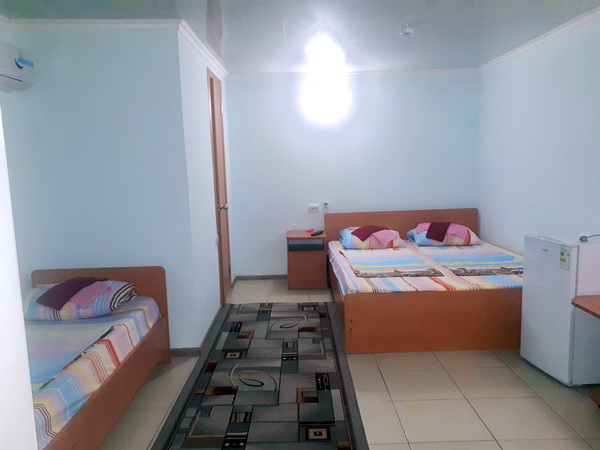 Капитальный одноэтажный корпус. Номера 1-2-3 местные с дополнительным местом и семейный 3-4- местный двухкомнатный номер. Все номера с удобствами ( душ, туалет, умывальник, холодная и горячая вода), холодильник, ТВ-плазма, сплит-система.
