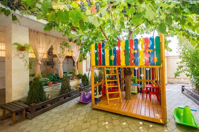 На территории имеется летняя кухня, мангал, детская площадка, бассейн, солярий, батут. По желанию, можно питаться в кафе и столовых, расположенных в радиусе 5 минут.