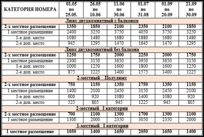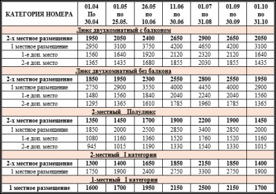 Услуги, входящие в стоимость путевки: проживание в номере соответствующей категории со всеми удобствами (телевизор, телефон, холодильник, сплит-система, сан.узел, ванна/душ); питание: полный пансион (заказное меню); пользование аптечкой, гладильной комнатой, вызов такси, доставка почты.