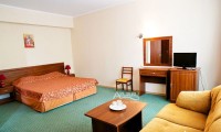 В каждом номере: две односпальные кровати(или одна двуспальная), прикроватные тумбочки, журнальный столик, набор посуды, платяной шкаф, телевизор, сплит-система, холодильник, набор посуды. Есть возможность размещения третьего гостя на доп. месте. Есть номера с видом на море. Площадь 18 кв.м